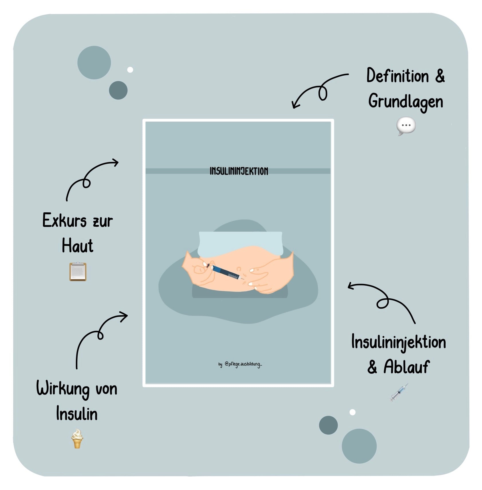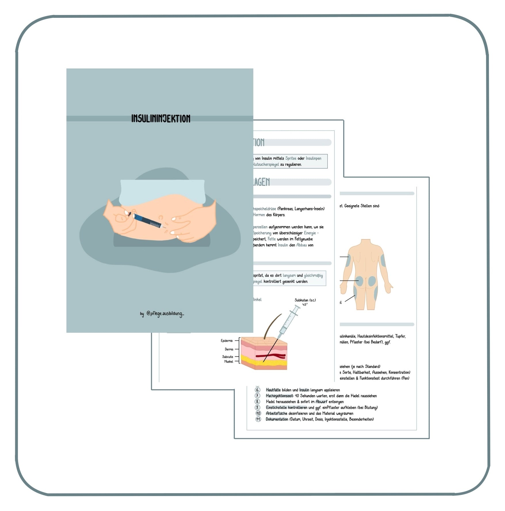 Mit dieser PDF erhältst du einen vollständigen Überblick über Wirkung, Injektionsarten, geeignete Einstichstellen und den genauen Ablauf einer Insulininjektion.